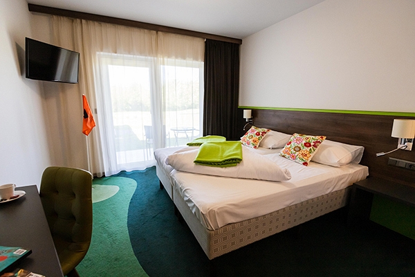 Élvezze a felejthetetlen napokat a napsütéses, a golfpálya területével kapcsolatos kényelmes szobáinkban. A modern kétágyas Greenhouse klímával, zuhanyzóval, WC-vel, golf TV-vel, terasszal és gyakorló mini putt pályával felszereltek. A reggeli ideje alatt a panorámás étteremből csodás kilátás nyílik a golfpályára. Lehetőség van a golfjátékot követően relaxálni, pihenni a 300 méterre található Európa vezető családi élményfürdőjében a Sonnen Therme*****-ben. A bőséges reggelin kívül még az alábbi szolgáltatásokkal várjuk kedves vendégeinket: